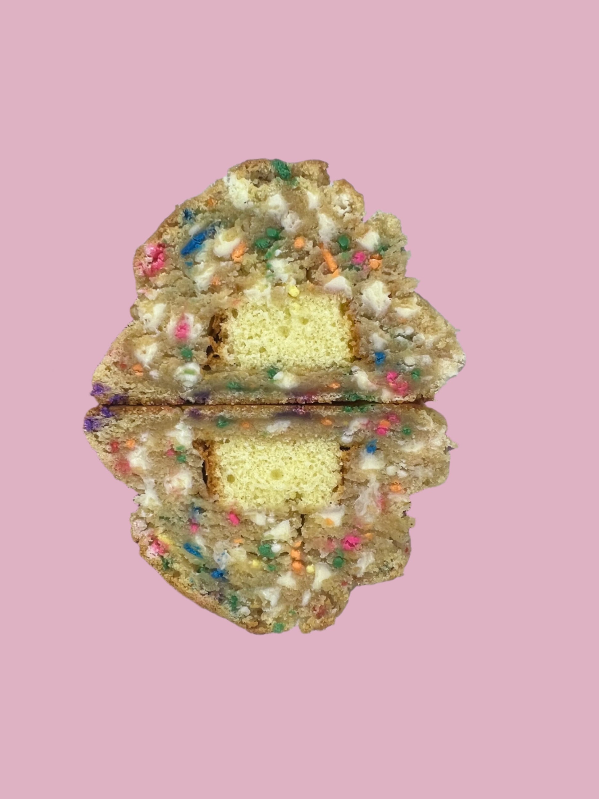 White Chocolate chip with sprinkles and cake dough filled with cake.