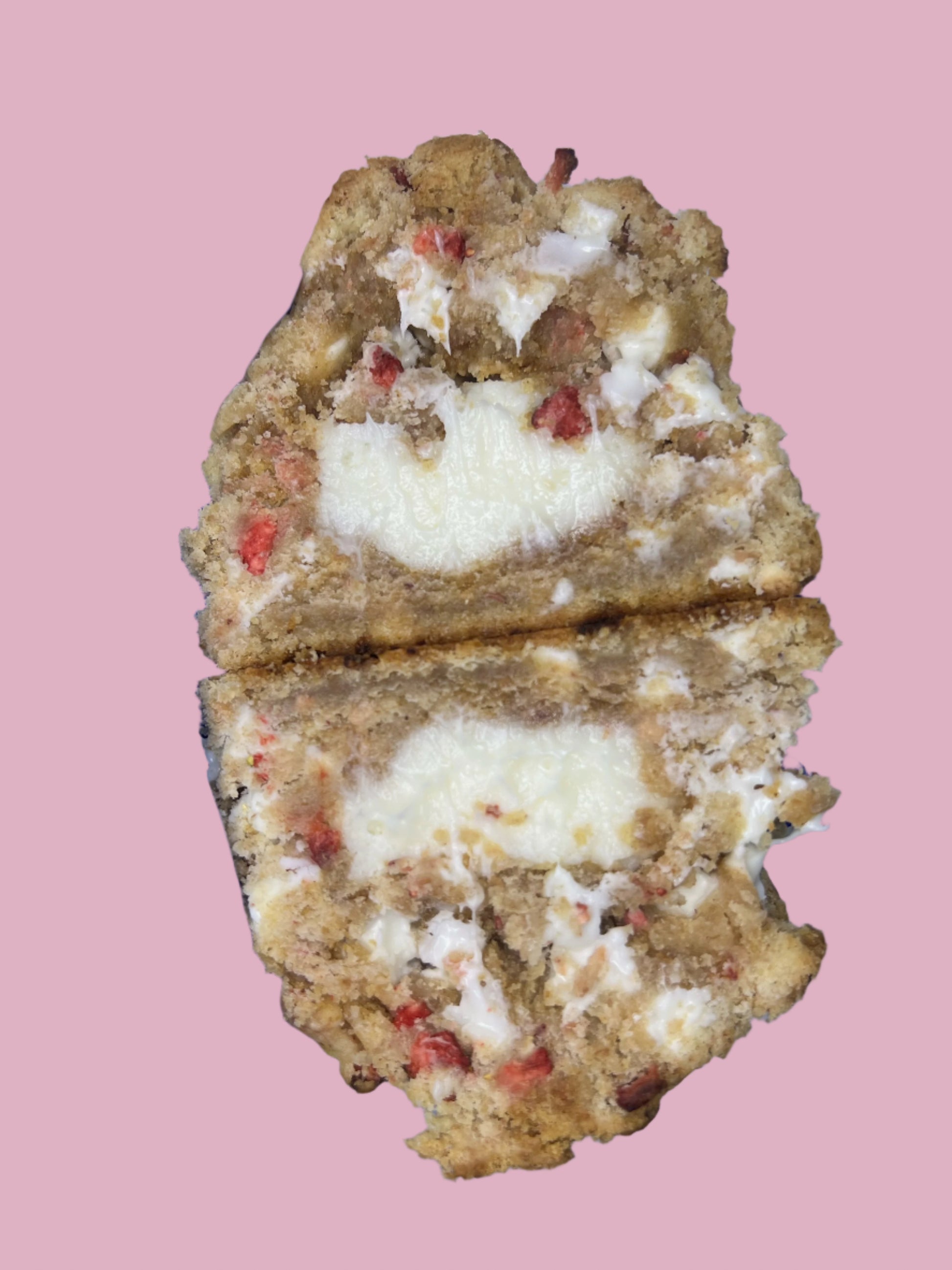 Strawberry cookie with dry strawberry filled with cheesecake filling.